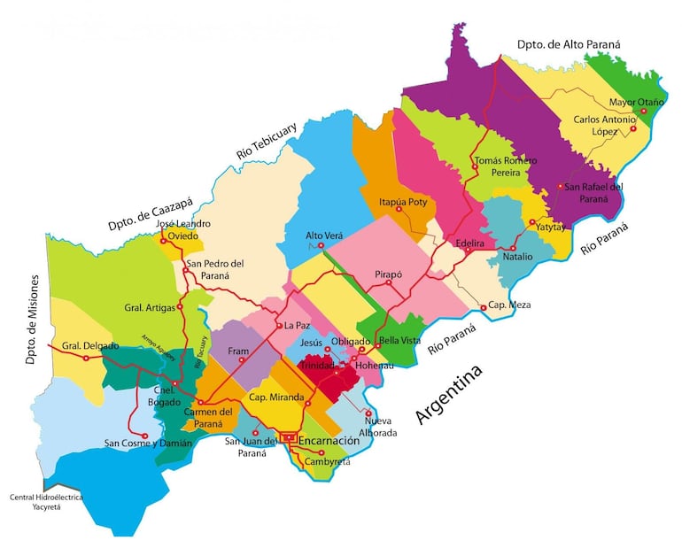Sus principales ríos son: Paraná y Tebicuary. También se encuentra el arroyo Tembey, donde están ubicados los famosos saltos del Tembey, Yacuy y Tacuary, y el Quiteria, que desembocan en el río Paraná.