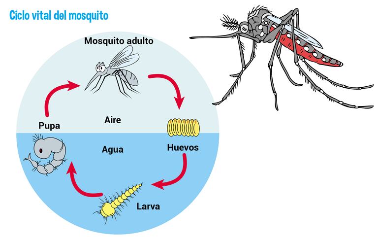 El mosquito Aedes aegypti se reproduce en recipientes con agua, como cubiertas, botellas, potes, juguetes, bebederos, tachos, baldes, entre otros. Si el clima es cálido su ciclo vital se completa en una semana.