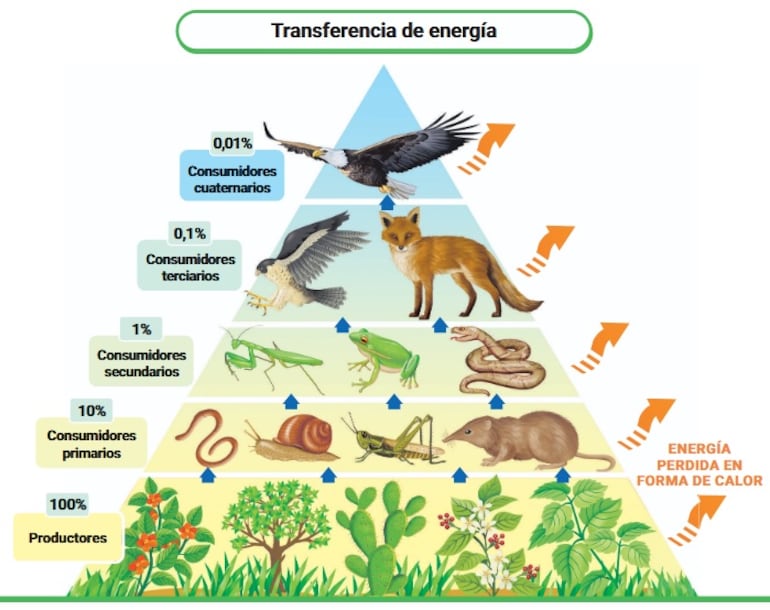 En la pirámide energética siguiente se destaca la transferencia de energía entre niveles tróficos, productores y consumidores.