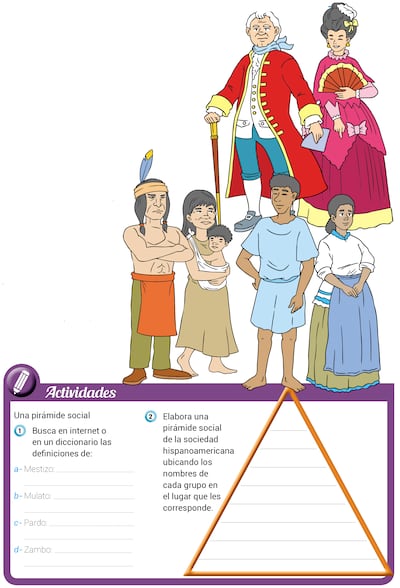 Con base en los grupos culturales y al dominio de los europeos sobre los pueblos originarios, la sociedad colonial hispanoamericana se estructuró según el origen racial de las personas; los españoles peninsulares (españoles nacidos en España) y los españoles americanos o criollos (hijos de madre y padre españoles pero nacidos en América); después los mestizos; los indios; los mulatos, pardos y negros libres; los zambos, y, finalmente, los esclavos (fueran estos negros o mulatos), quienes ocupaban la parte inferior de la sociedad. Para designar las diferentes mezclas raciales que integraron las sociedades hispanoamericanas y las posiciones que cada una ocupaba, se usó el término castas.
