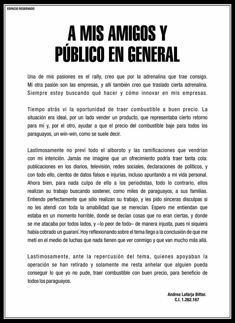 Ahora bien, para nada culpo de ello a los periodistas, todo lo contrario, ellos realizan su trabajo buscando sostener, como miles de paraguayos, a sus familias. Entiendo perfectamente que sólo realizan su trabajo, y les pido sinceras disculpas si no les atendí con toda la amabilidad que se merecían. Espero me entiendan que estaba en un momento horrible, donde se decían cosas que no eran ciertas, y donde se me atacaba por todos lados, y –lo peor de todo– de manera injusta, pues ni siquiera había cobrado un guaraní.