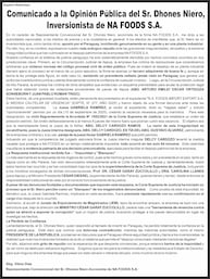 Representante Convencional del Sr. Dhones Niero Accionista de NA FOODS S.A.