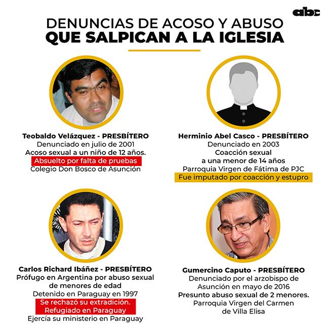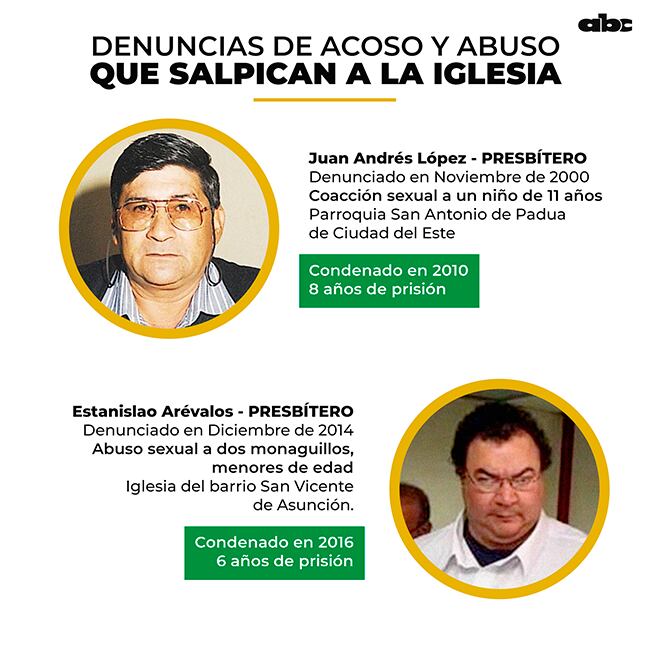 En 2010 el sacerdote Juan Andrés López Sosa fue condenado a 8 años de prisión por violar a un niño de 11 años en Ciudad del Este. Otra sentencia conocida y más reciente es de 2016, con una condena de 6 años de prisión al sacerdote Estanislao Arévalos, quien abusó de dos monaguillos en la Iglesia del barrio San Vicente de Asunción.