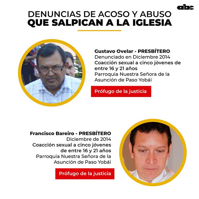 Un caso más terrible sucedió en Paso Yobái, Guairá. Seis jóvenes de entre 16 y 21 años entre los años 2011 y 2013 fueron manoseados, abusados y presionados a tener contacto sexual por el entonces párroco Gustavo Adolfo Ovelar Núñez y el vicario Francisco Javier Bareiro Acosta, según sostiene una acusación del Ministerio Público. Un catequista empezó reunir los testimonios de las víctimas y, con la ayuda de un sacerdote de San Juan Bautista, se organizaron para denunciarlos ante su congregación y ante la Justicia, a fines de 2014.