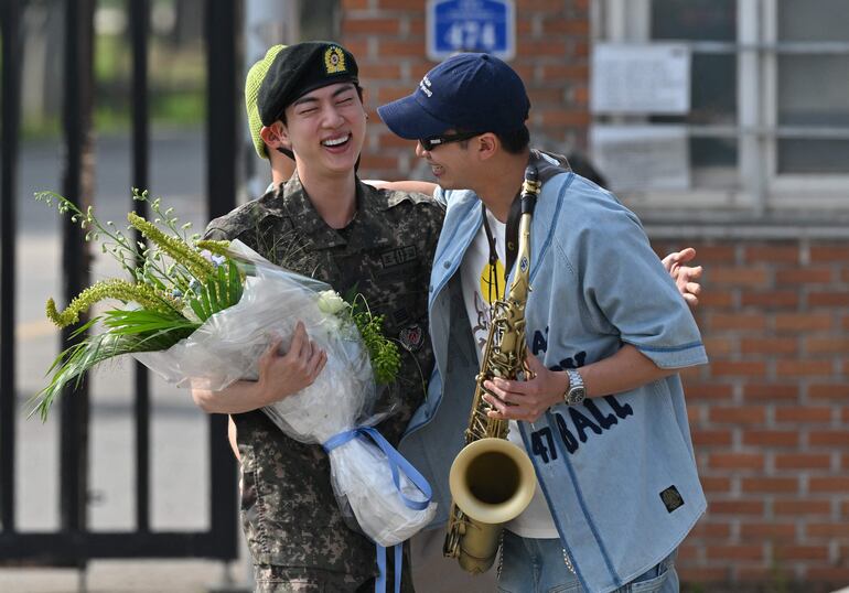 Jin, el mayor del grupo y el primero en alistarse, salió a primera hora de hoy de la base militar en Yeoncheon, donde le esperaban varios de sus compañeros de la banda.