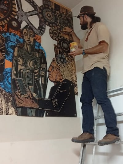 Joel Riveros formó parte de una instancia de capacitación en la técnica del xilomural realizada en la ciudad de Buenos Aires, en el Taller de Muralismo y Arte Público de la Escuela Superior de Educación Artística Manuel Belgrano.
