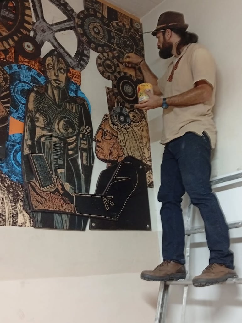 La formación estuvo a cargo del maestro y muralista argentino Marcelo Carpita, referente en arte público y conocedor de una técnica que articula el grabado, la gráfica y el mural. El xilomural combina el uso de matrices talladas en planchas de MDF, trabajadas con gubias, sobre las que se aplican tintas gráficas y pintura acrílica diluida. Estas matrices pueden imprimirse sobre papel afiche o fijarse directamente a la pared, atornilladas según la composición, dando como resultado murales de interior que, en algunos casos, integran también la pintura directa del muro como parte del diseño.