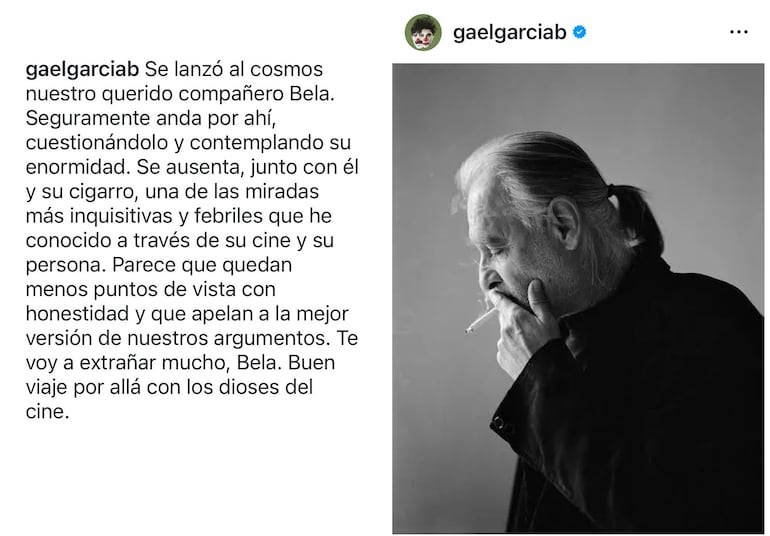 “Se lanzó al cosmos nuestro querido compañero Bela. Seguramente anda por ahí, cuestionándolo y contemplando su enormidad. Se ausenta, junto con él y su cigarro, una de las miradas más inquisitivas y febriles que he conocido a través de su cine y su persona. Parece que quedan menos puntos de vista con honestidad y que apelan a la mejor versión de nuestros argumentos. Te voy a extrañar mucho, Bela. Buen viaje por allá con los dioses del cine”, escribió Gael, destacando la honestidad brutal y la capacidad de cuestionar la realidad de Béla Tarr.