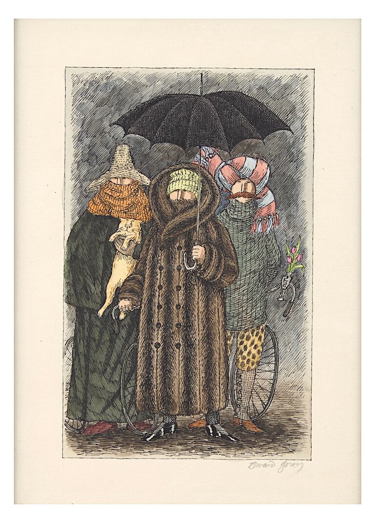 Desde sus primeros encargos como ilustrador para Doubleday Anchor Books, sus dibujos aparecieron en las portadas de libros como Drácula, de Bram Stoker, La guerra de los mundos, de Herbert George Wells, o El libro de los gatos habilidosos del viejo Possum, de T. S. Eliot. Ilustró más de 300 libros, varios de ellos bajo seudónimos. Disfrutaba de manera inquietante firmando sus obras con diversos anagramas de su propio nombre para disfrazar fantasiosamente su identidad real. Gorey no llegó a conocer este tercer milenio, pero, dada su singular personalidad, cabe imaginar que, de haber vivido hasta el día de hoy, quizá podría divertirse de una forma bastante similar llenando las redes sociales de falsos alter ego suyos en sus ratos libres...