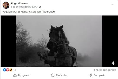 “‘No olvides lo que realmente quieres decir, no hay recetas, la receta eres tú’. Hasta siempre Maestro, nos dejaste el mejor cine del mundo. Te voy a extrañar. Béla Tarr / 21.07.1.955 - 6.1.2026″, escribió Paz Encina. Por su parte, Hugo Giménez publicó un fragmento de El caballo de Turín con la frase: “Réquiem por el Maestro. Béla Tarr (1955-2026)”.