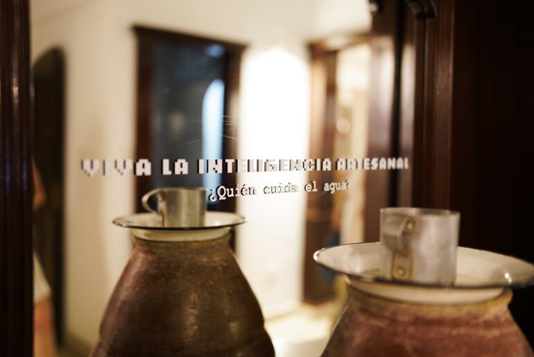 Explicaron que la muestra establece un contraste entre el desperdicio invisible del agua, producido por las tecnologías modernas, incluyendo la inteligencia artificial, y las tecnologías ancestrales de cuidado, almacenamiento y transporte del agua, encarnadas en el kambuchi.