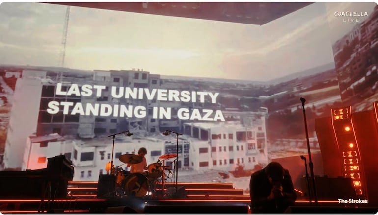 The Strokes eligieron la protesta política para cerrar su presentación en Coachella. Mientras los músicos tocaban, en las pantallas gigantes del escenario desfilaban imágenes de figuras políticas silenciadas o derrocadas en operaciones de la CIA y de ataques de Estados Unidos e Israel contra Irán y Palestina.