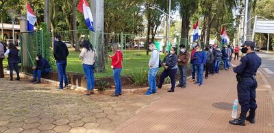 Los contribuyentes se ubicaron en fila respetando el distanciamiento social y el uso obligatorio de tapabocas. También se exige lavado de manos antes del ingreso al recinto.
