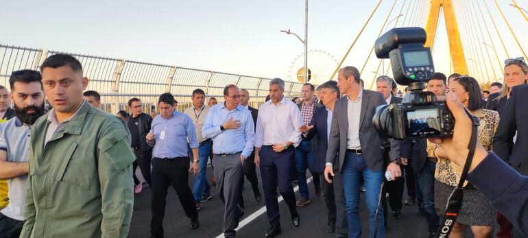 Al término del acto, el presidente Abdo Benítez, quien estuvo acompañado por el canciller nacional Julio Arriola, representantes de la Itaipú y autoridades locales, se dirigieron hasta la línea divisoria de la frontera, ubicada en el medio del puente, para luego finalizar el recorrido. El jefe de Estado no dio declaraciones a la prensa.