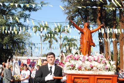 Al término de la misa, los feligreses se concentraron frente al templo y con banderines blancos en manos hicieron un cordón humano para primeramente dar paso a un desfile de imágenes que se fueron ubicando sobre la avenida Juan B. Flores. Algunas de ellas fueron: Divino Niño Jesús, San Francisco de Asís, San Lorenzo, Sagrada Familia, María Auxiliadora, San José, San Roque y Santa Lucía, entre otros.
