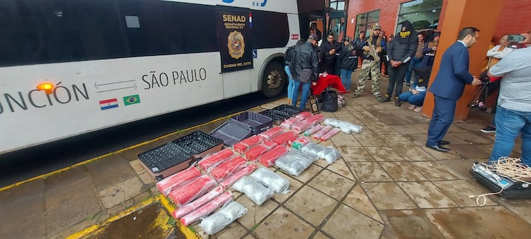 Agentes de la Secretaría Nacional Antidrogas (Senad), encabezados por el fiscal Elvio Aguilera, ejecutaron un operativo en la tarde de este viernes, en la terminal de buses de Ciudad del Este. Los intervinientes recibieron información de que en uno de los colectivos se estaría transportando una importante cantidad de estupefacientes.