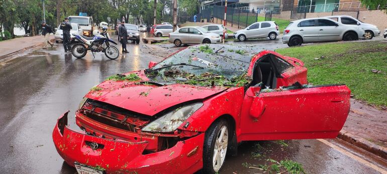 El vehículo afectado es de la marca Toyota modelo Celica, color rojo, chapa XBH 839, que quedó con la parte frontal prácticamente aplastada debido al impacto. Además, las ramas alcanzaron un poste del tendido eléctrico, dejando a las viviendas y comercios ubicados alrededor del Lago de la República sin energía eléctrica.