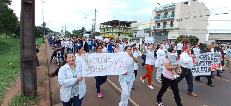 Los manifestantes realizaron una caminata y sentata sobre la ruta PY07 (ex- Supercarretera) donde con cánticos y pasacalles solicitaron un reajuste salarial para el personal de salud.
