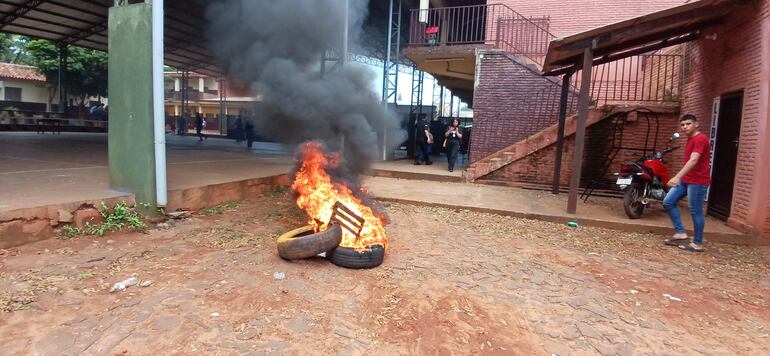 En un momento, los estudiantes rodearon la Dirección donde la directora de la institución permanece encerrada. Esto motivó la llegada de agentes policiales para mediar la situación. Luego los estudiantes quemaron cubiertas en el patio, pero por pedido de los agentes del orden apagaron las llamas.