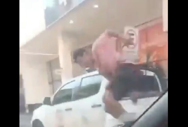 Transeúntes que pasaban por la avenida Adrián Jara del microcentro de Ciudad del Este captaron el momento en que un joven forcejeaba con dos agentes policiales y un guardia de seguridad, que trataban de detenerlo. Otro sujeto, que ya se encontraba en la carrocería de la patrullera en carácter de demorado, aprovechó la situación para escapar.