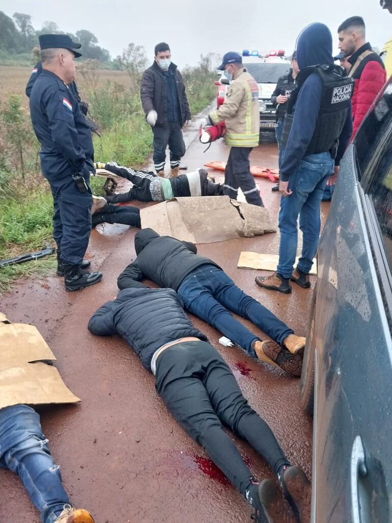 El abatido es un adolescente de 16 años, fugado del Centro Educativo del Este, el 16 de marzo pasado, mientras que los aprehendidos son: Víctor Manuel López Valdez (30), Jorge Cardozo Espínola (39), Carlos David López Acosta (29), Marcos David Martínez Villalba (20) y Lucas Enmanuel Fernández Martínez (19), resultó herido.