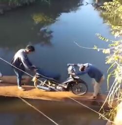 Para poder cruzar, arriesgando sus vidas, de forma improvisada y sin ningún tipo de seguridad colocan angostos tablones de madera que sobraron de la estructura vieja.