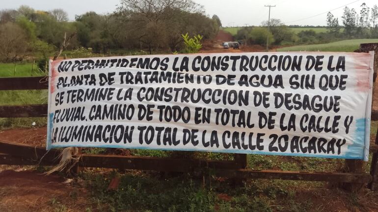 “No permitiremos la construcción de la planta de tratamiento de agua sin que se termine la construcción del desagüe pluvial, del camino y de la iluminación en el Km 20 Monday”, reza el cartel.