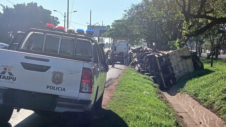Agentes de la Comisaría 7ª recibieron un aviso por teléfono sobre el vuelco de una carreta que generaba un gran embotellamiento sobre la Ruta PY02, en dirección al microcentro. Al llegar al lugar, encontraron un tractocamión de la marca Scania, modelo 124-360, estacionado en la banquina, mientras que el semirremolque de la marca Randon estaba volcado en la cuneta.