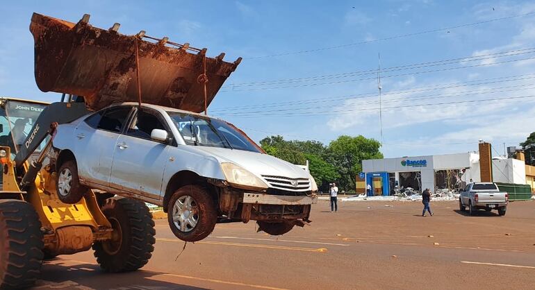 Los intervinientes confirmaron que se trata de uno de los vehículos utilizados por el grupo criminal, compuesto por paraguayos y brasileños, para llegar hasta la entidad bancaria, detonar la bóveda y llevarse un botín cuyo monto aún se desconoce.