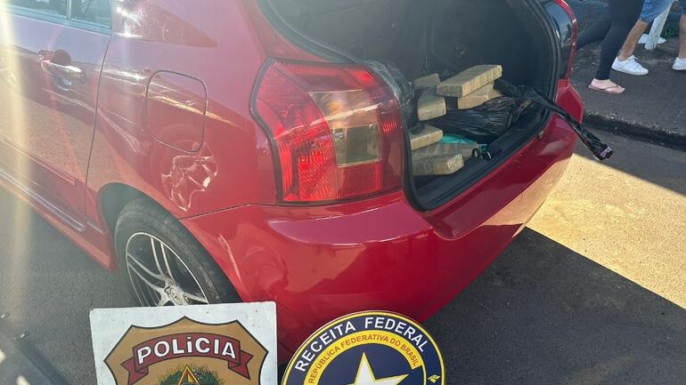De inmediato, solicitaron el apoyo de la Policía Rodoviaria Federal (PRF), que logró interceptar un vehículo Toyota Runx, color rojo, con chapa paraguaya. Al inspeccionar el automóvil, encontraron 33 kilogramos de marihuana prensada en el maletero.