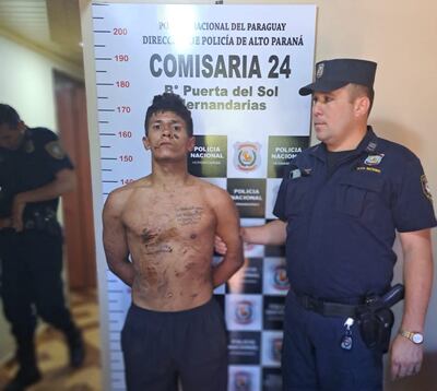 La detención del presunto asaltante se registró esta tarde a las 13:30 aproximadamente, en la vía pública del asentamiento Tacurú Pucú de Hernandarias. Se trata de Guido Alexis Benítez Cañete, de 21 años de edad, quien registra antecedentes por violencia familiar del año 2024. En el marco de este proceso, cuenta con prohibición de salir del país y prohibición de portar armas.