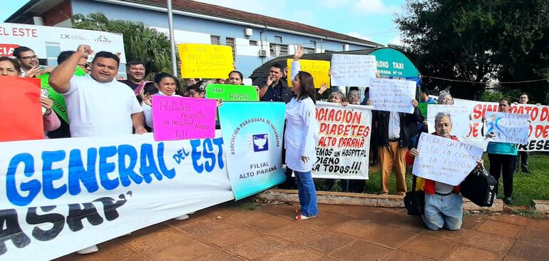 Con carteles y cánticos, médicos, pacientes, enfermeros y trabajadores en general se movilizaron esta mañana frente al Hospital Regional de Ciudad del Este. Con la medida de fuerza, exigieron al Gobierno mejoras en la salud pública en el décimo departamento y, principalmente, pidieron por la construcción del Gran Hospital del Este para Alto Paraná.