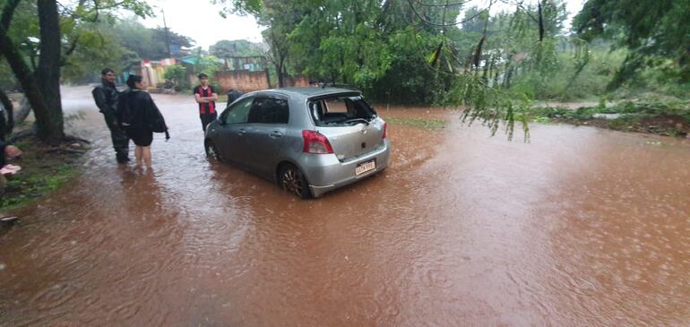 En una de las calles, un automóvil Toyota Vitz, quedó varado en uno de los raudales formados. Además de sufrir daños mecánicos, uno de sus vidrios se rompió. Cuando el nivel del agua bajó, vecinos ayudaron para retirar el vehículo del lugar.