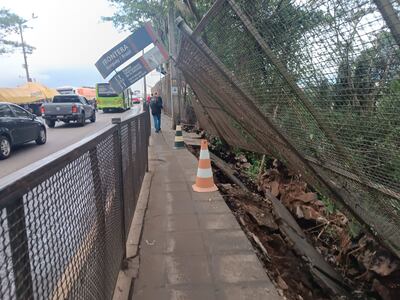 La estructura metálica cedió al desbordarse la base, lo que provocó una inclinación peligrosa del vallado para los peatones que se dirigen desde Ciudad del Este hacia Foz de Yguazú, Brasil.