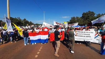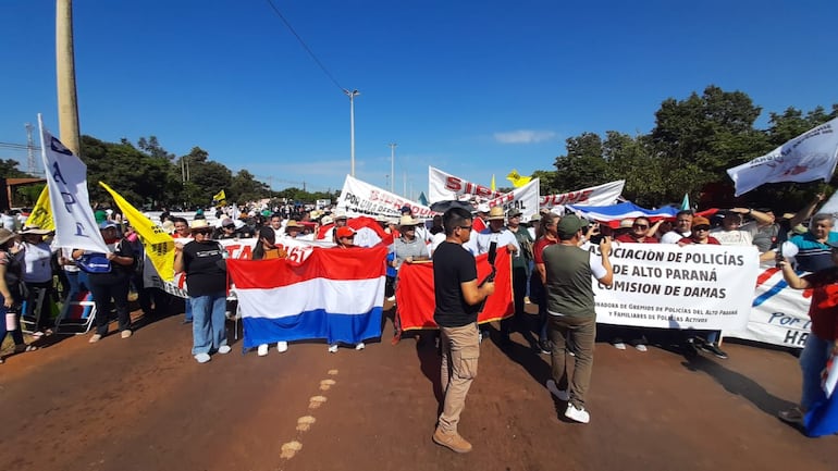 En la movilización participan gremios de policías retirados, personal de enfermería y docentes del Alto Paraná, quienes se adhieren a la protesta en rechazo a la propuesta del Poder Ejecutivo.