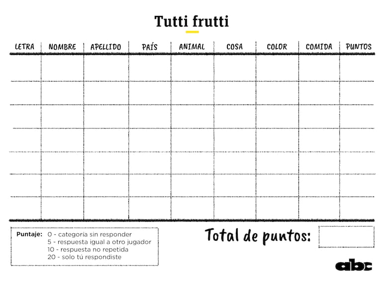 ¿Cómo se juega? Se eligen categorías (nombre, fruta, país, color, etc.). Luego, se dice una letra al azar. Todos deben escribir una palabra que empiece con esa letra en cada categoría. El primero en terminar grita “¡Tuti fruti!” y todos paran. Se suman puntos: 10 por palabra única, 5 si alguien repitió. Gana quien tenga más puntos tras varias rondas.