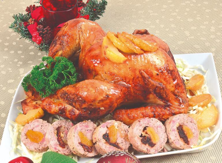 4. Mezclar los ingredientes del relleno, rellenar el ave y cerrar con palillos. Con el resto del relleno, se puede hacer un arrollado y envolverlo con papel aluminio. Se cocina en el horno junto con la pavita.