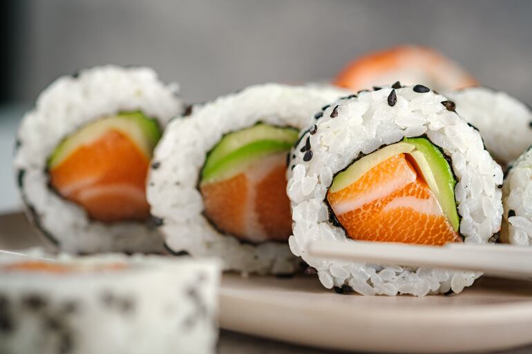 - Cortar finamente el salmón y colocar encima del roll de modo que cubra todo el arroz.