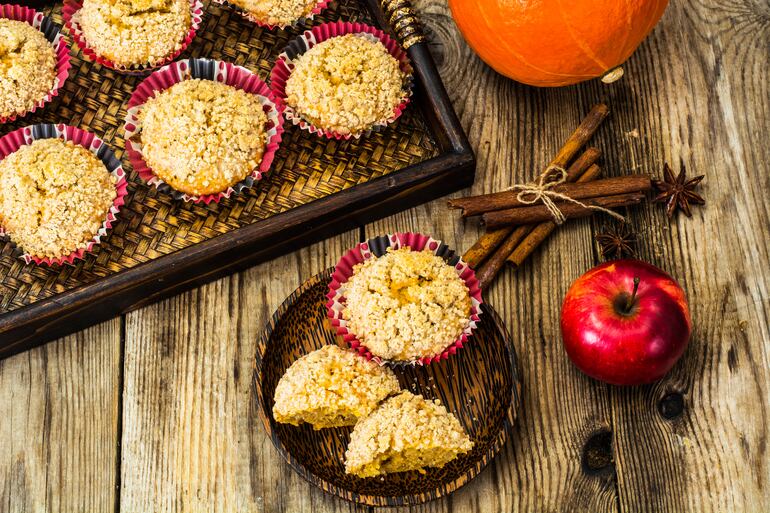 - Cargar los moldecitos de cupcakes con la masa, colocar encima un poquito de manzanas picadas y cubrir uniformemente con el streusel. Para prepararlo únicamente juntar todos los ingredientes con las manos hasta que queden en forma de miguitas.