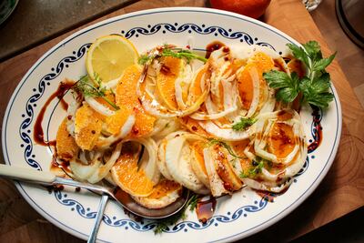 - Disponer en los platos la ensalada de hinojo. Poner encima las rodajas de naranja y las aceitunas. Verter el jugo. Decorar con granos y yemas de hinojo.