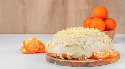 Pastel festivo con glaseado de chocolate blanco y mandarinas