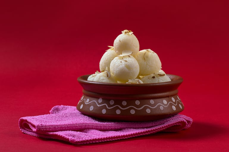 - Apagar el fuego, añadir el agua de rosas al almíbar y dejar reposar las rasgullas dentro del líquido hasta que se enfríen a temperatura ambiente.