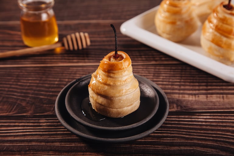 - Colocar cada pera en un plato de postre. Bañar las peras con la salsa de miel templada justo antes de servir.