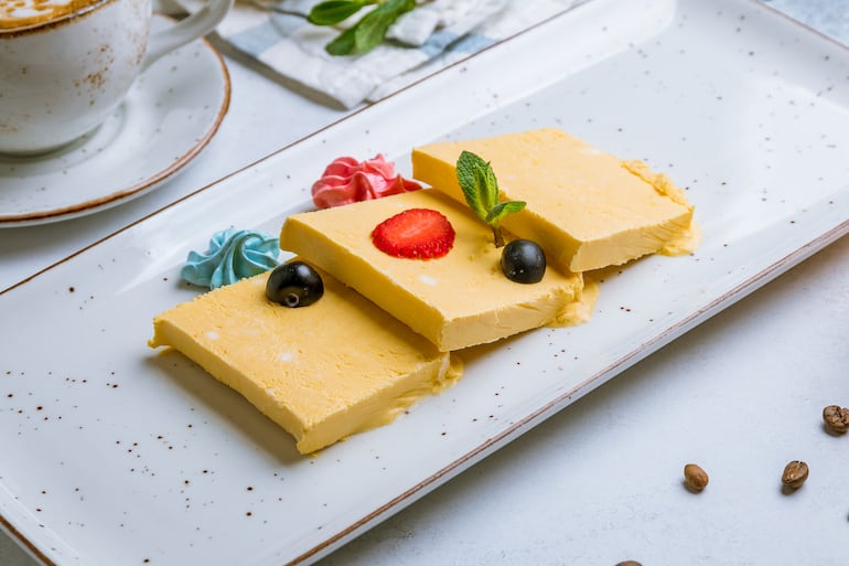- Retirar del congelador 10 minutos antes de servir, desmoldar y cortar en porciones.