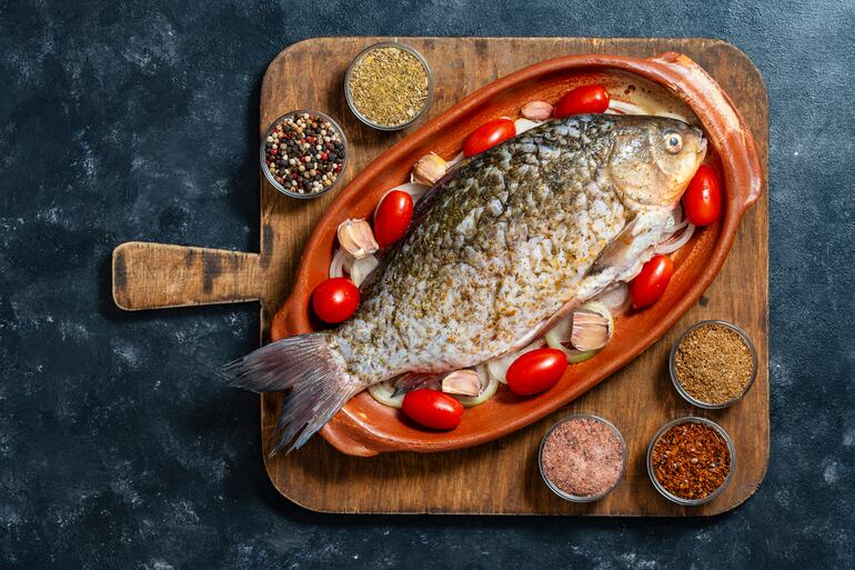 - Lavar el pescado bajo un chorro suave de agua fría y secar muy bien la superficie con papel de cocina. Dejar las escamas del pescado intactas y pedir en la pescadería o retirar solo las vísceras por una pequeña incisión ventral.