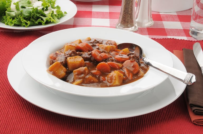 - Calentar una olla grande a fuego medio-alto. Añadir una cucharada de aceite y dorar la carne en dos tandas, utilizando la cucharada restante de aceite para la segunda tanda.