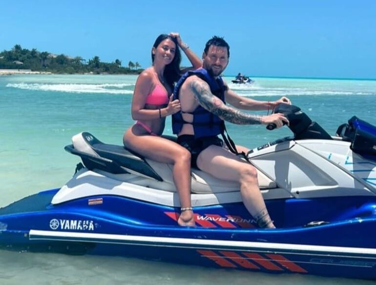 Desde las paradisíacas playas de Bahamas, Antonela Roccuzzo compartió algunas postales suyas, de Leo y de ambos juntitos disfrutando de un paseo en moto acuática en el Caribe.