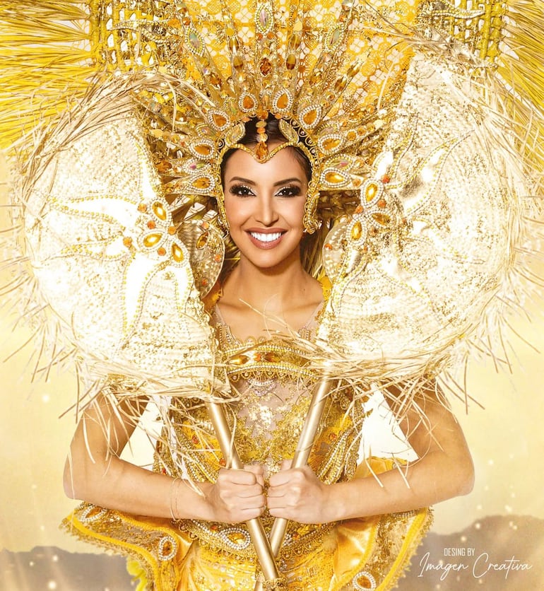 “El traje alegórico de la Miss Grand Paraguay 2023 está inspirado en el sol resplandeciente del Paraguay, donde cada día los campesinos laboriosos cultivan la tierra fértil guaraní, cosechando sus cultivos y para protegerse del mismo, usan el famoso ‘sombrero piri’, hecho de Karanday, a mano por artesanas hacendosas, o utilizan la pantalla tradicional para refrescarse del calor abrazador de nuestro país”, se explica en las redes de Maelia Salines sobre el traje que presentó en Vietnam y estuvo elaborado con karanday y encaje ju, adornados con cristales y pedrería en colores amarillos y dorados para simular los destellos del sol.