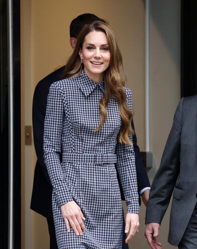 La princesa de Gales retomó su agenda en Londres y apareció enfundada en un vestido midi en gris y negro con estampado de “pata de gallo”, que lleva la firma de la diseñadora Emilia Wickstead.