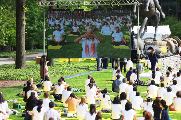 Narendra Modi, que está en Estados Unidos en visita oficial, se sumó a la multitud congregada en los jardines del complejo de Naciones Unidas en una sesión matutina de yoga y, minutos antes, defendió las bondades de esta práctica en un discurso.
